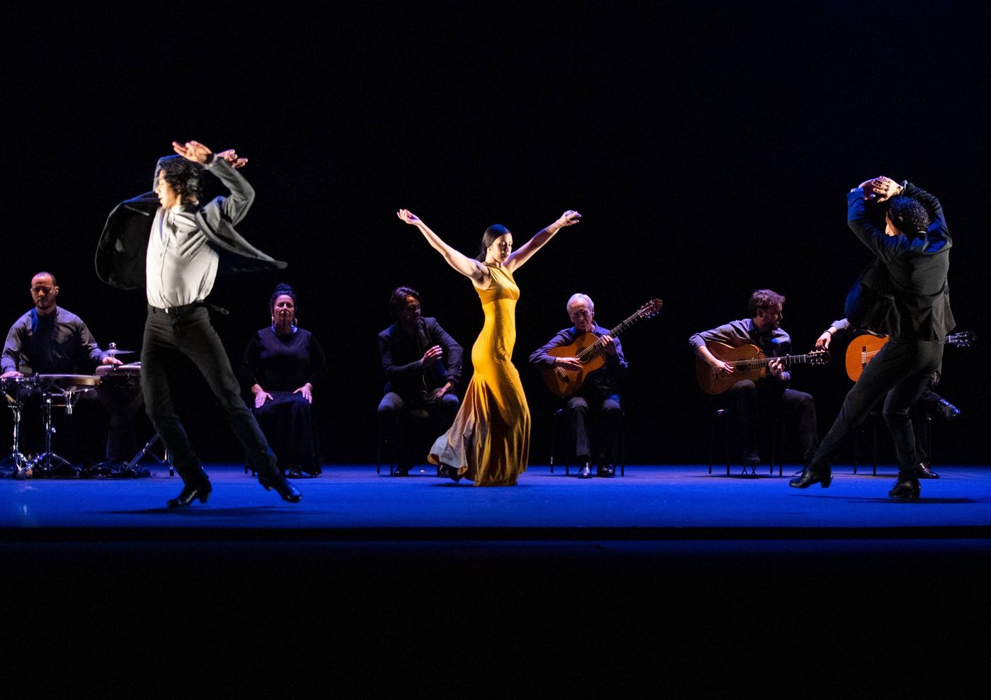 Image description: Two musicians and two dancers perform on a bright blue floor with a black backdrop. The musicians are sitting and playing guitars. The dancers are in the centre of the image, one wearing a yellow dress and the other is in a black suit. They are dancing together in a strong pose with arms reaching out.