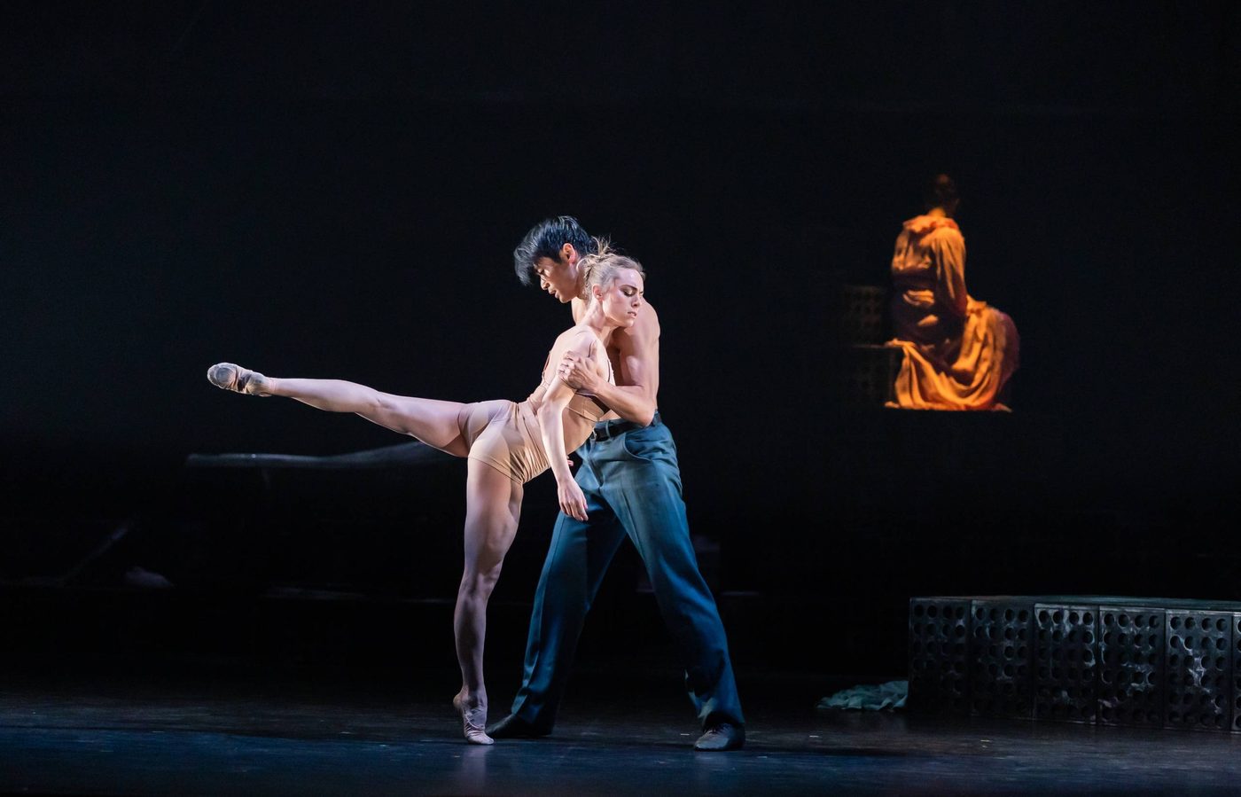 Image description: Two dancers – Blanche and Stanley – stand in front of a plain orange wall with a naked bulb shining bright between them. The male dancer is standing with his back to the camera. He is wearing a white sleeveless top and brown trousers. His arm muscles are very obvious and he looks powerful. He is looking to the right at a female dancer and is holding her wrist. She is wearing a peach coloured dress which is soft and flowing. She is looking at the male dancer but reaching in the opposite direction as if she is trying to pull her wrist away.