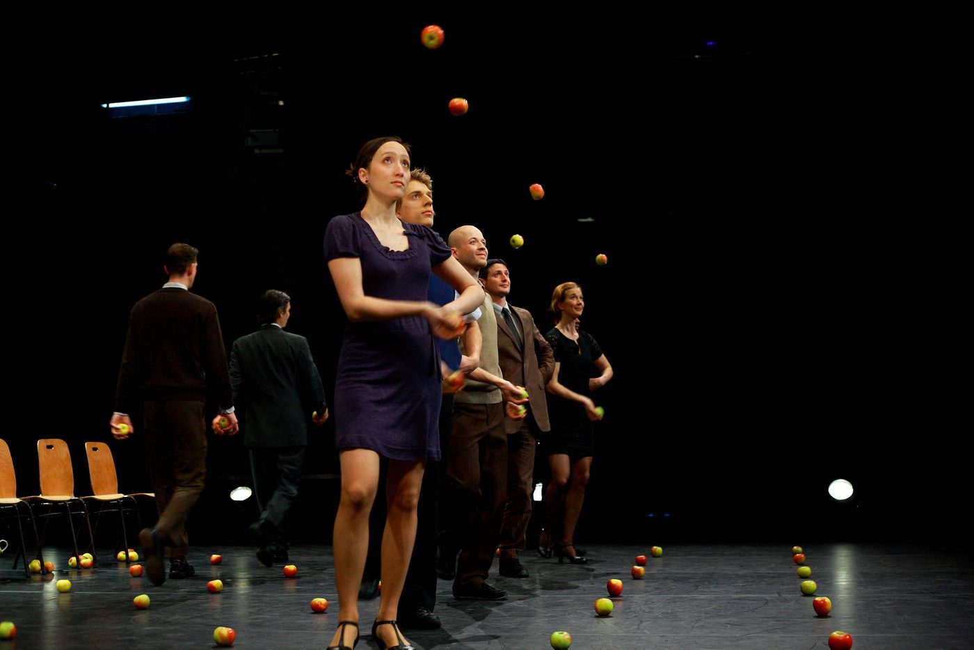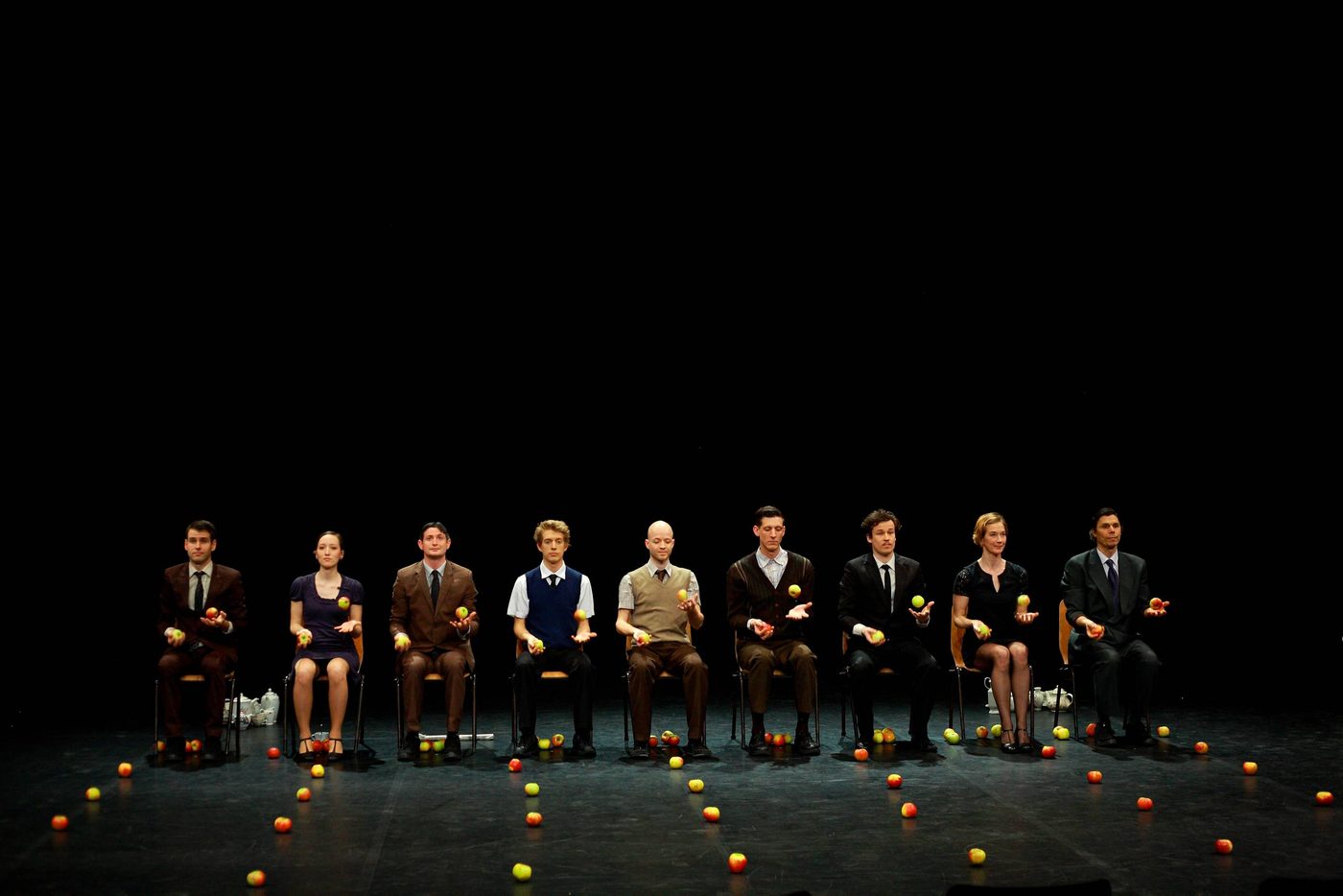 Image description: Seven people are sitting on a row of chairs. They are wearing smart clothes that are black, grey, brown and navy. They are all throwing an apple in the air and the floor is littered with apples which you imagine have been dropped in previous attempts to juggle.