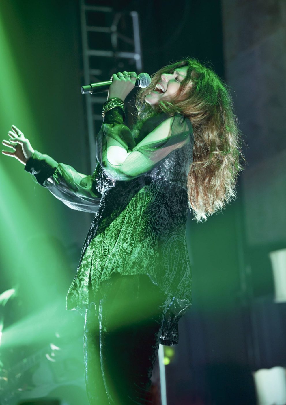 A woman tilts her head back and sings into a microphone, really immersed in the song. The background is full of paint-like strokes in pinks, purples and blues.