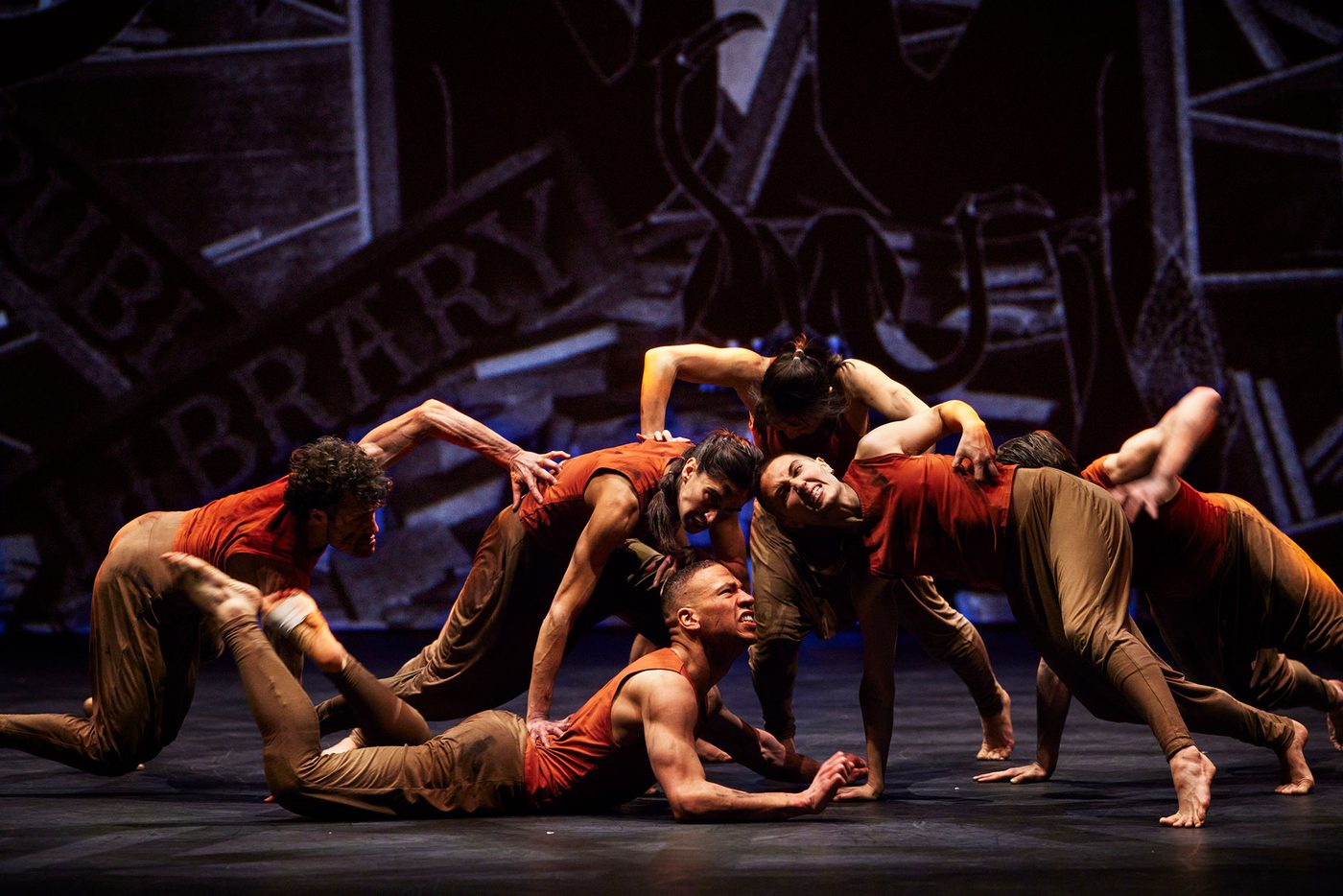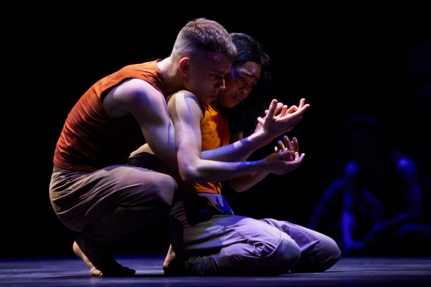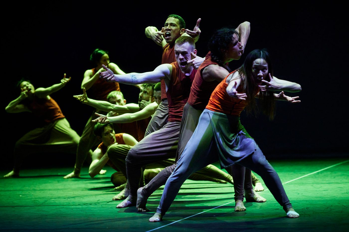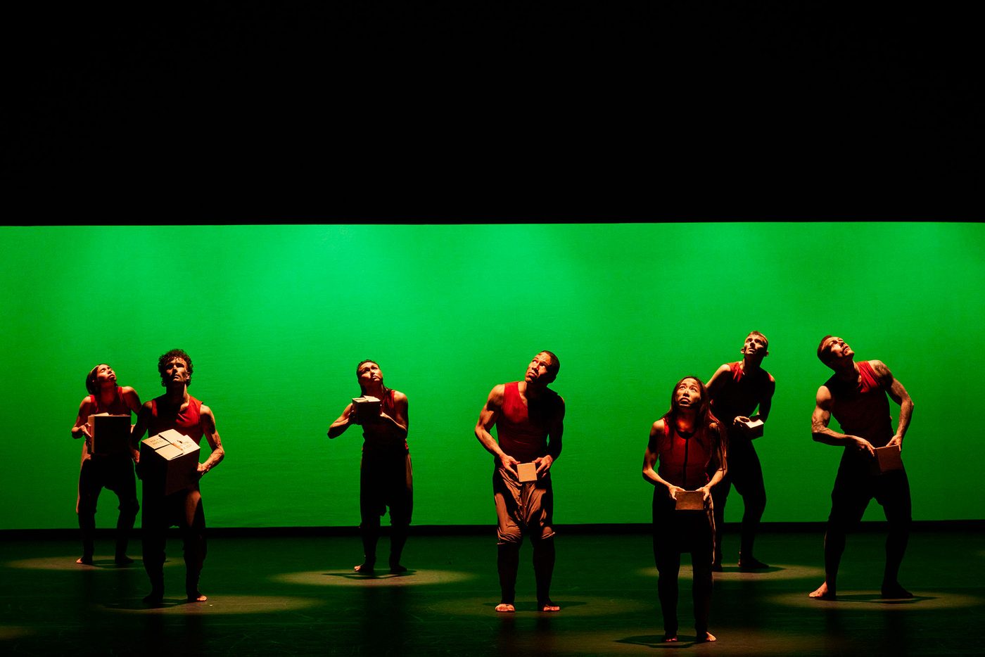 [Image description] Bathed in lush green light, six dancers arch backwards, legs in a wide stride, bare muscular arms raised overhead and fists clenched. They wear orange sleeveless tops in the style of life jackets and softly draped leggings.
