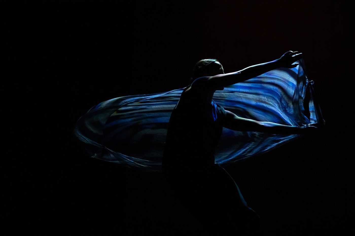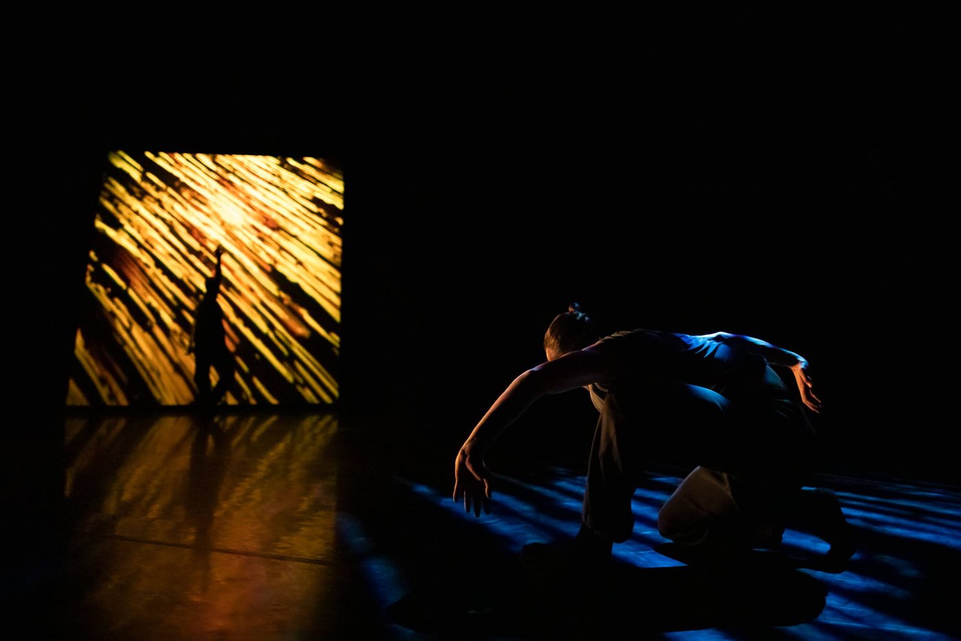 [Image description] A dancer is bent back backwards into a spiralling shape that echoes the spirals projected on the floor: knees bent almost to the floor, their torso is near horizontal; one arm extends towards the floor, the other is about to swing up. A light shower of dust or sand is descending onto them.