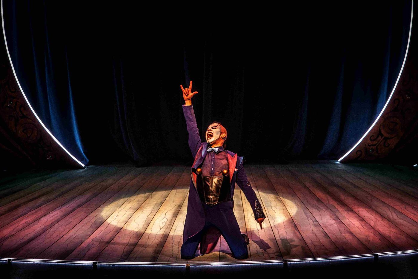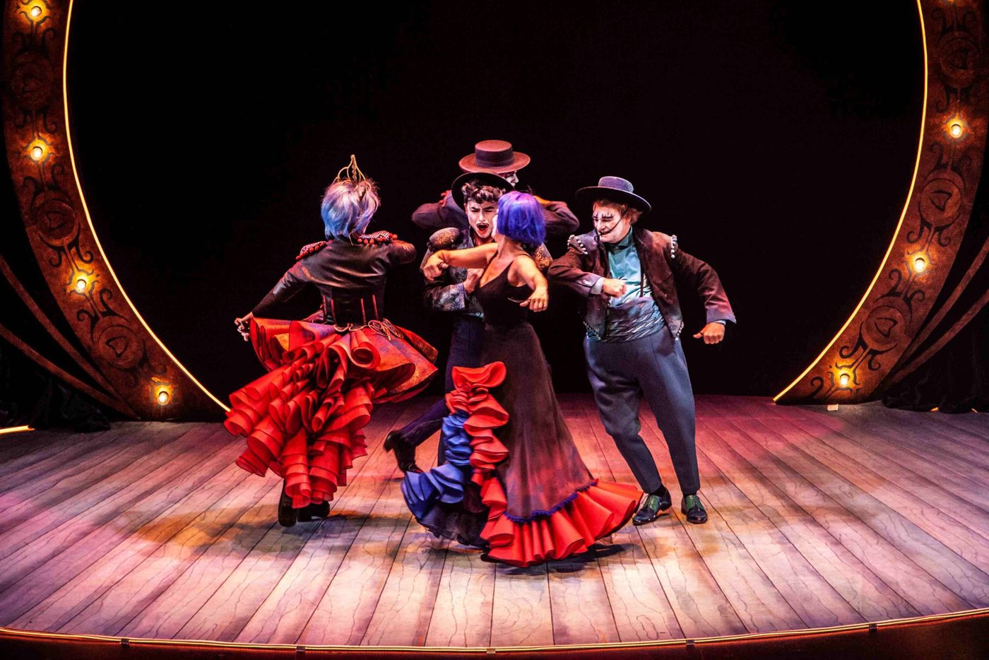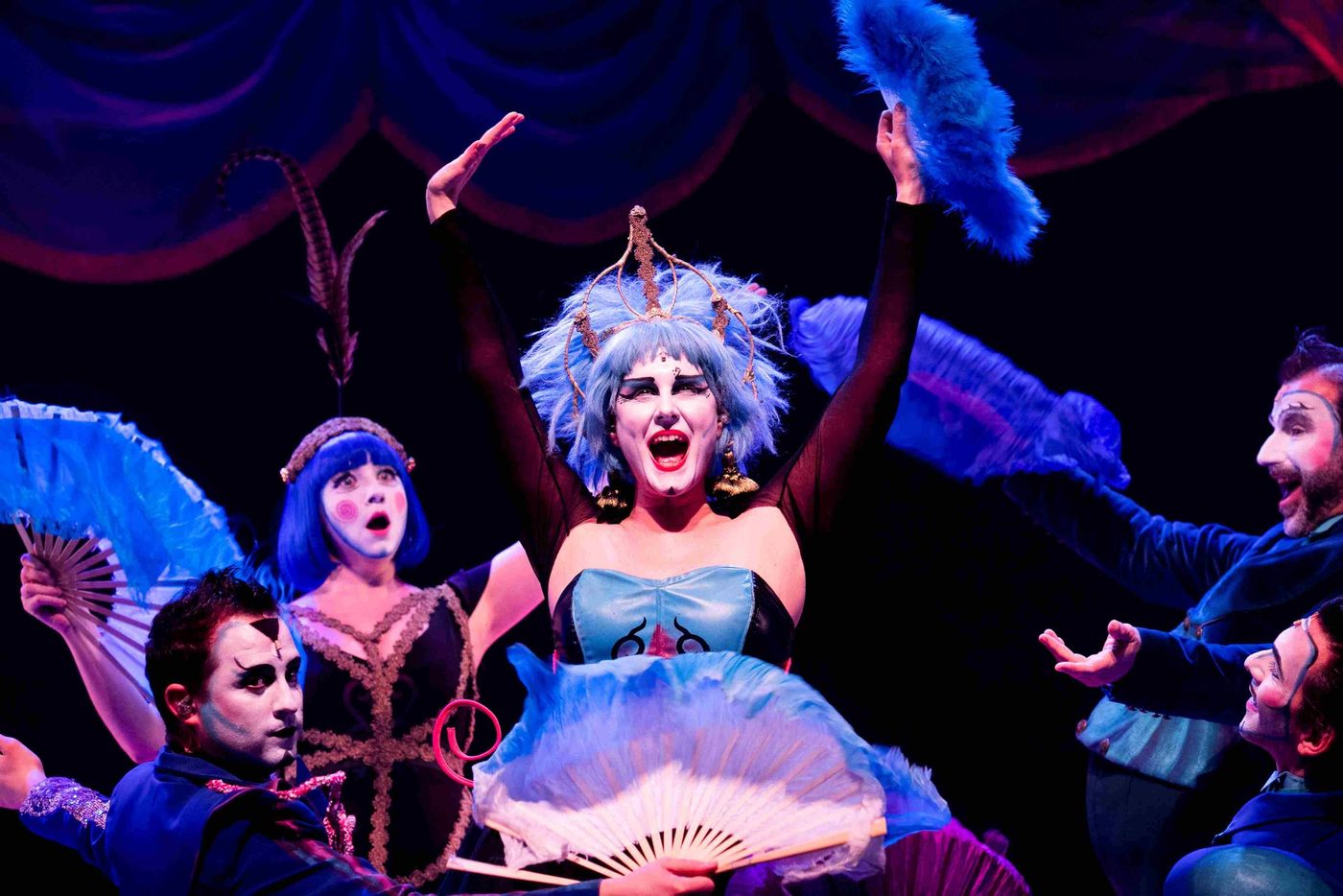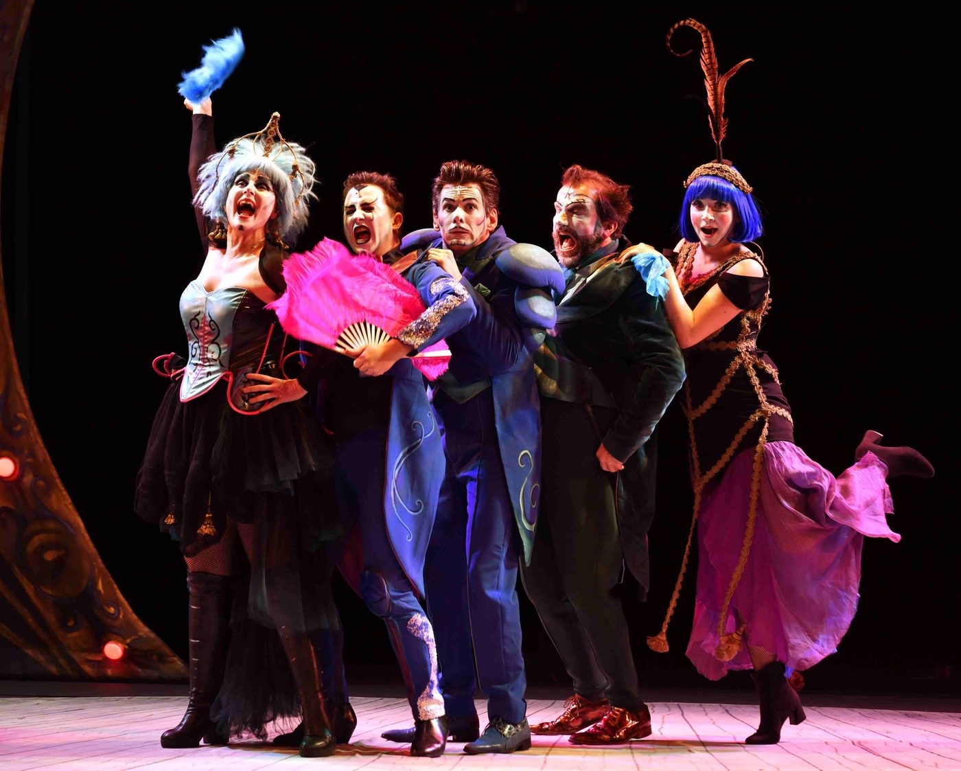 Image description: Five performers wearing eccentric blue, gold and black costumes pose inside a gold, arched frame. The frame has roses lining the bottom and has lightbulbs around the sides. Behind them is a navy velvet curtain. The female performers wear bright blue wigs and all are wearing exaggerated make up and face paint.