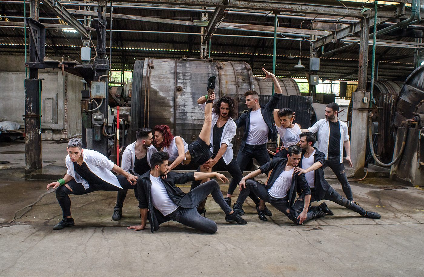 Image description: A company of ten dancers of white or Latin heritage, mainly men, face us, posed with a challenging gaze. They have neat moustaches and buzzed haircuts, and are in crisp white or black t-shirts and vests, with muscular arms on display, jeans carefully ripped. They sit or stand on or around a trestle table in a grey industrial space.