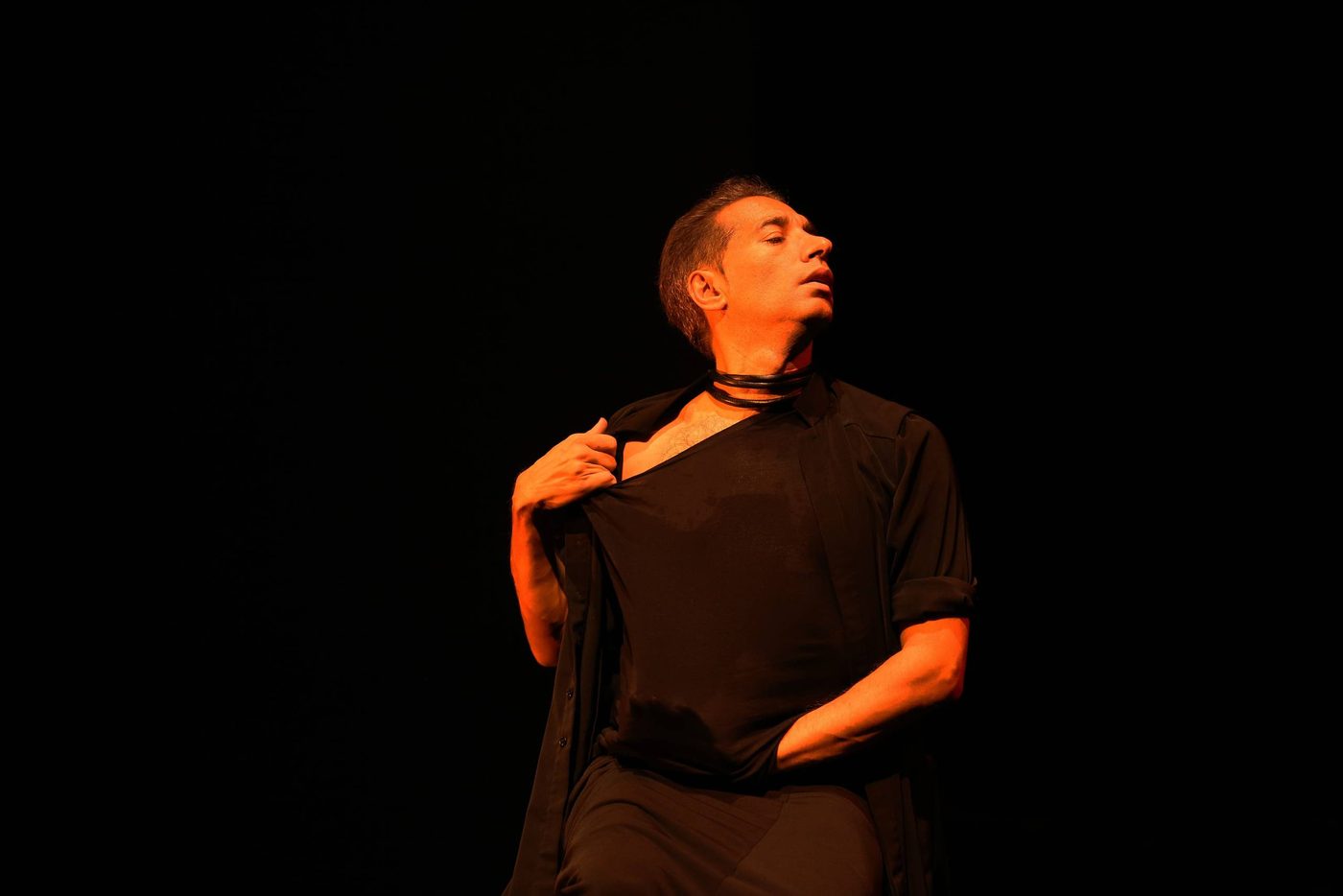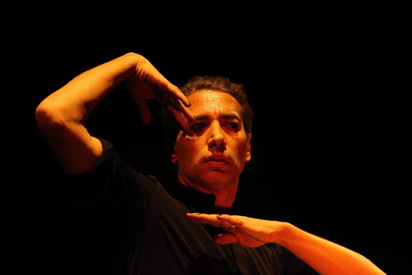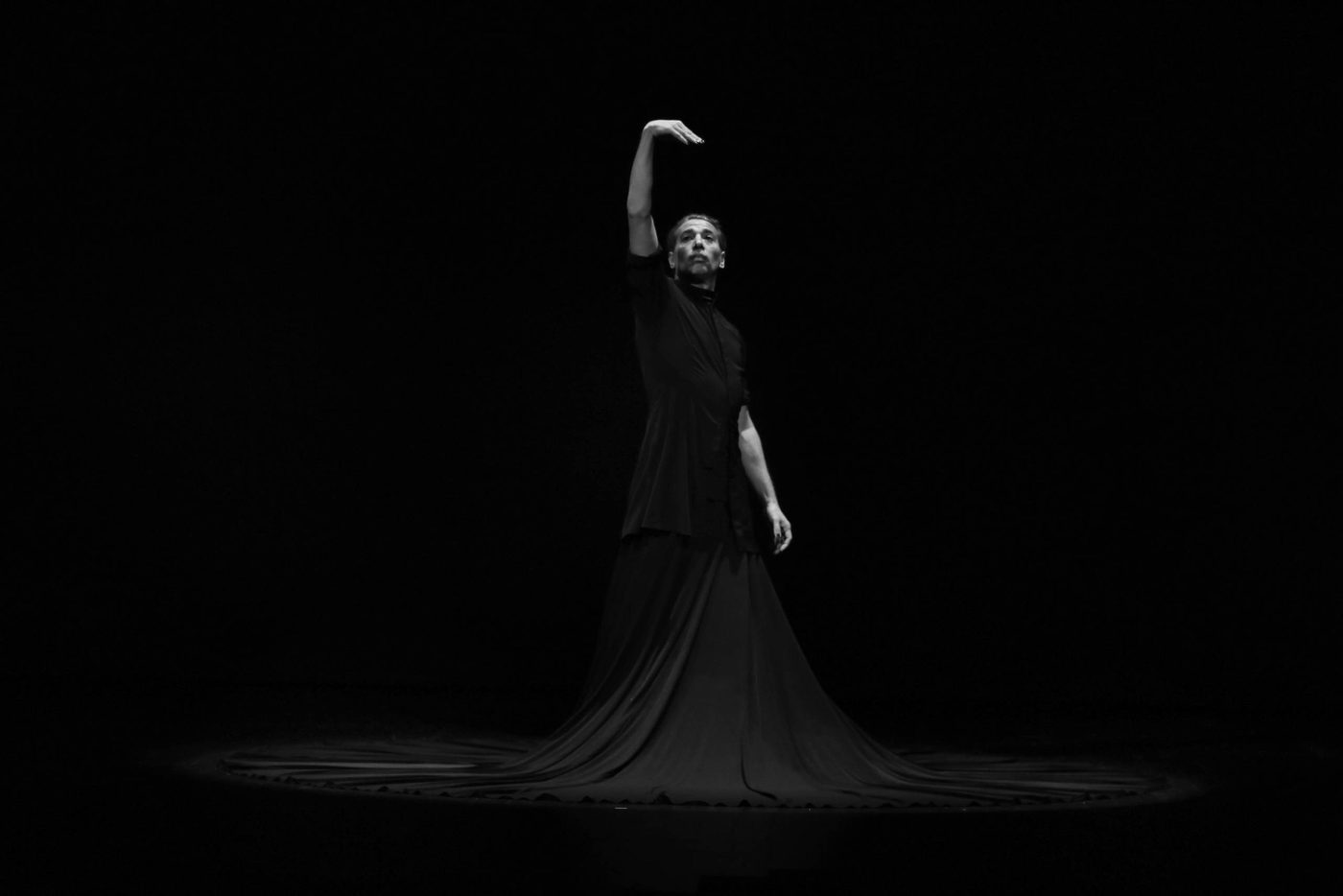 [Image description] In golden light, a man with short dark hair, wearing a long black shirt over a full black skirt, looks upwards, his arms forming a sinuous s-shape: the right arm is twisted elbow up, hand pointing downwards, the left arm is lifted in a curve, the hand pointing upwards.