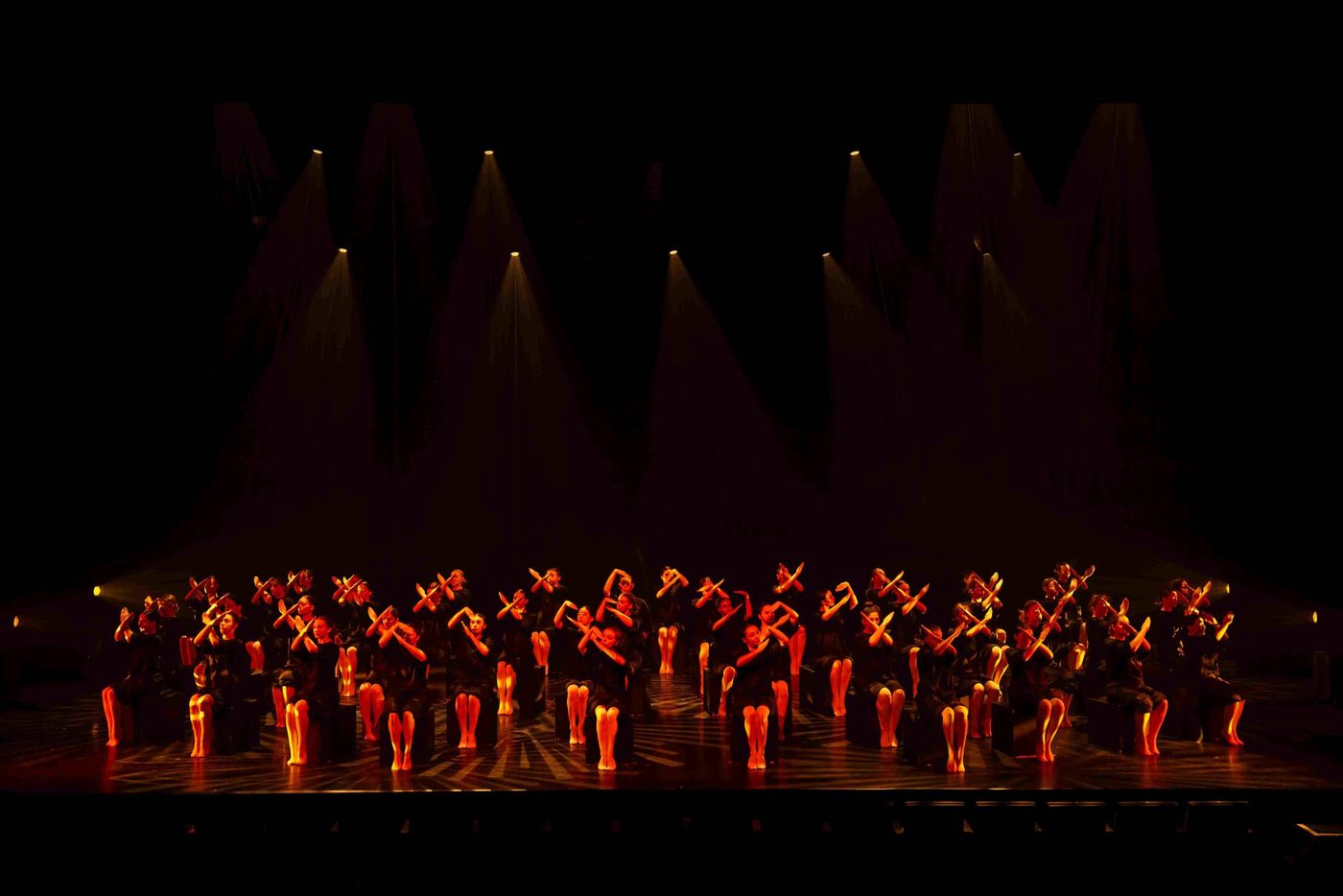 Header image description: Forty people stand in formation. There are ten people per row, the first row are sitting on the floor, the next row kneeling, the next row standing and the final back row are on a raised platform. In the center in front is a solo performer. Every performer has their arms held to form a 90 degree angle, with the right hand meeting their left elbow.