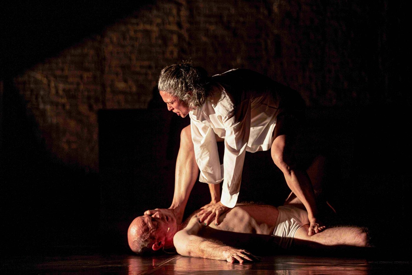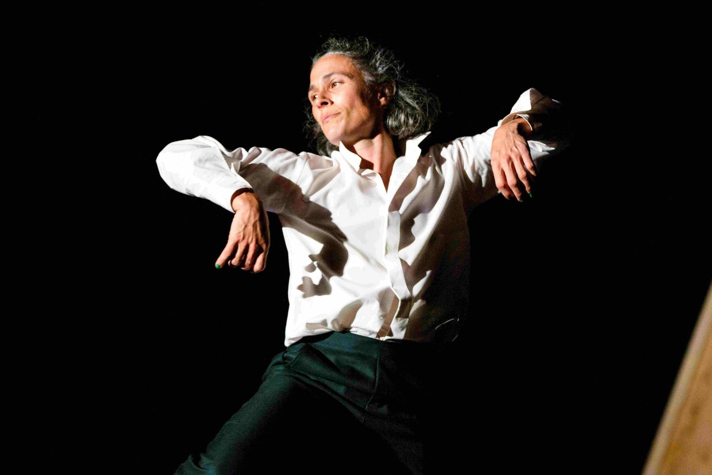 Header image description: A solo performer lunges in the centre of the image, one arm raised straight up, the other out behind him. He wears black trousers and a loose white shirt. Behind him is a brick wall, two ladders and a big box that someone is moving.