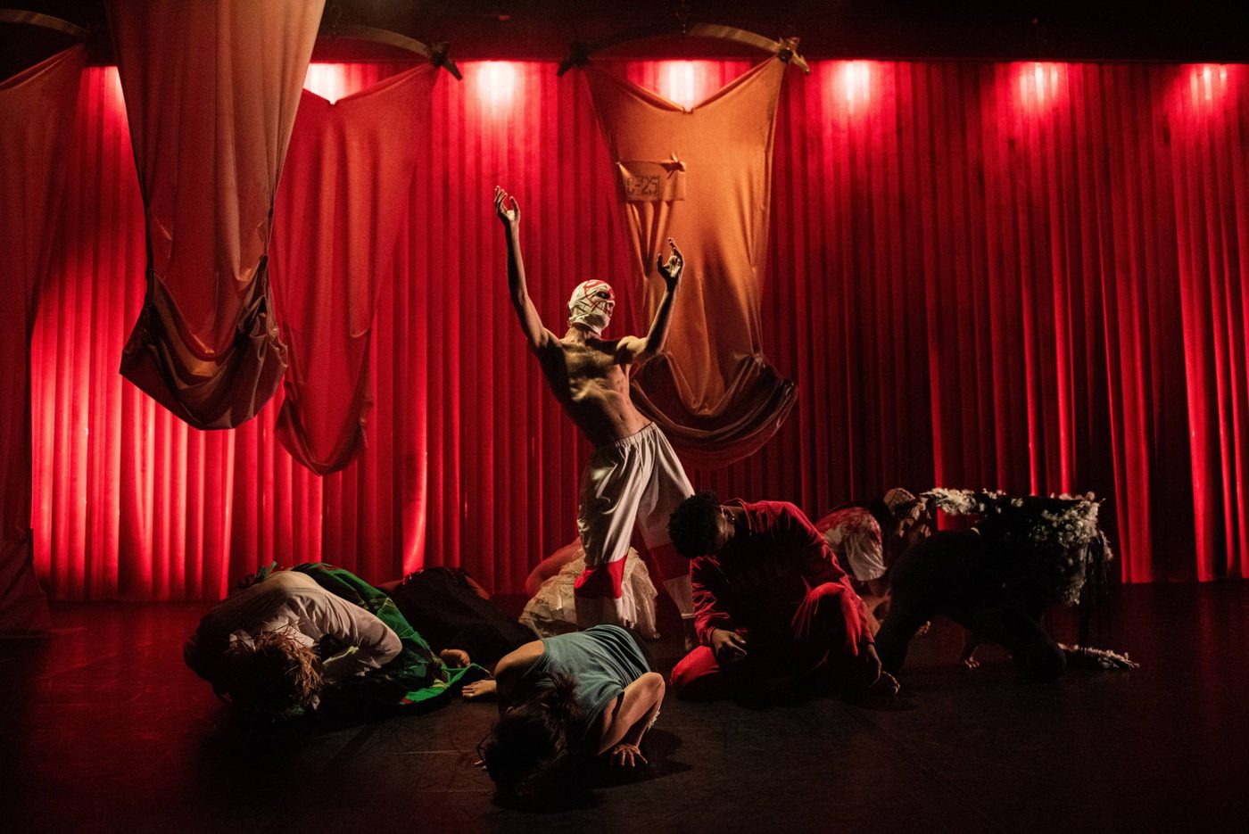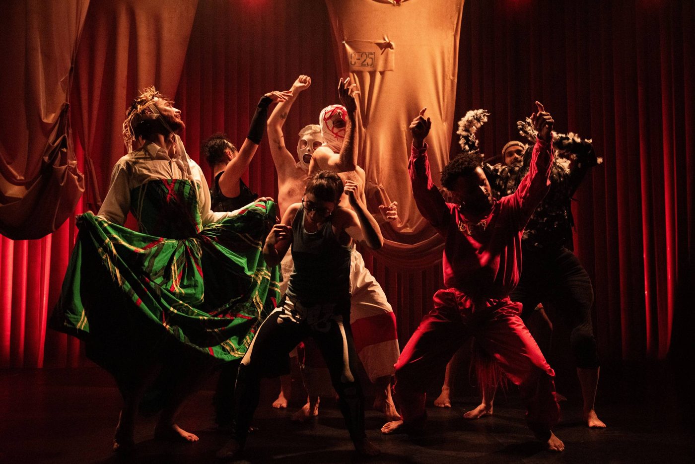 Header image description: A group of people dance expressively in a dark, red-lit setting. One person in the foreground wears a mask, while others move energetically in the background.