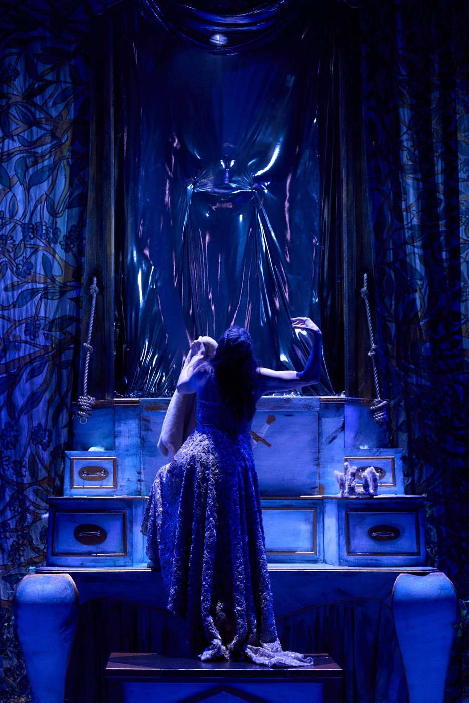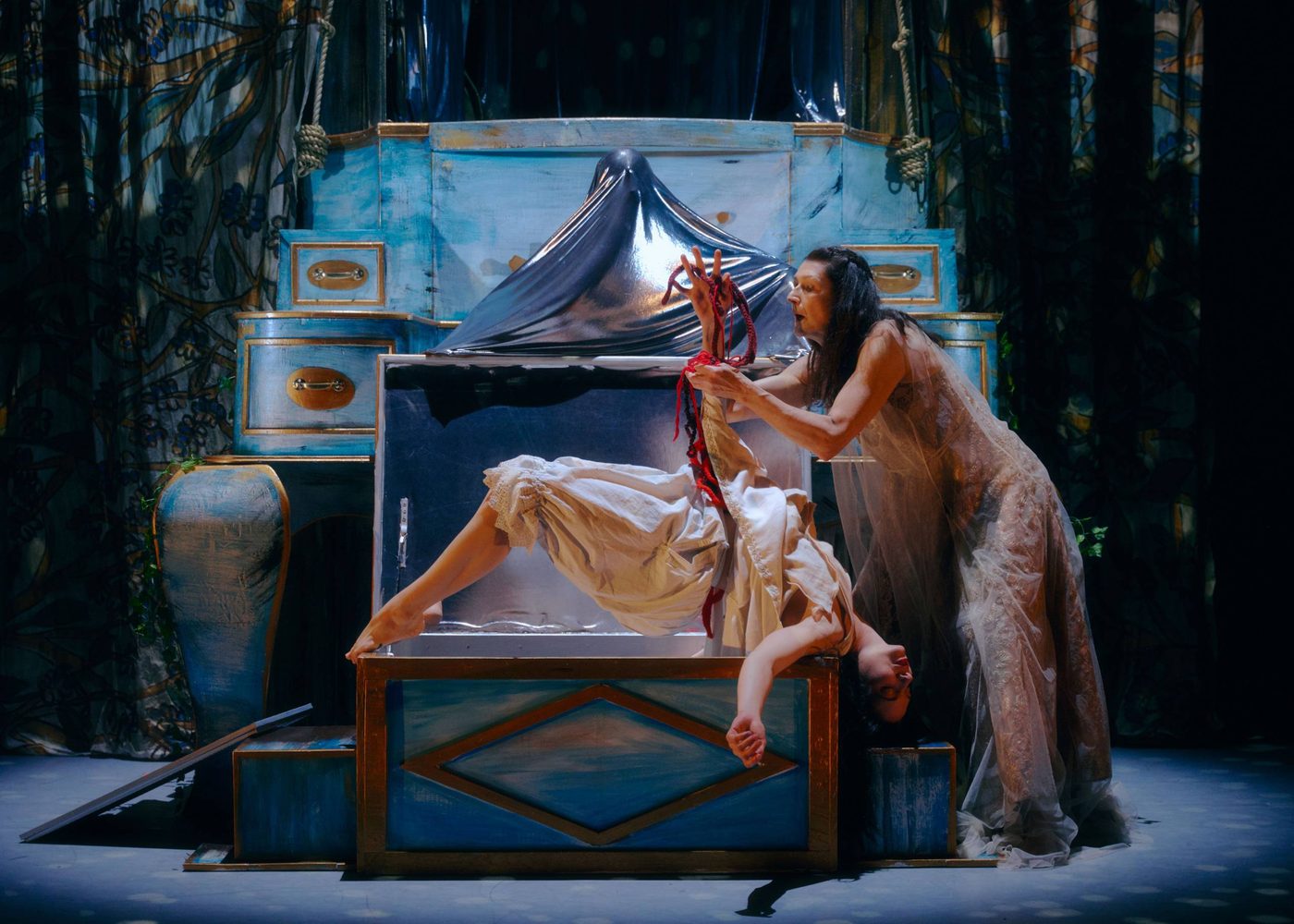 Header image description: One woman in an embellished floor length gown sits on a bench. Another woman in a satin slip is laid dramatically across her lap with her arms thrown back and a bitten red apple in one of her hands. Red threads which look like wool are being pulled from her torso as if she is being disembowelled. The sitting woman pulls at the threads with her raised arm and looks down her nose at the woman in her lap. Behind them is a wall bathed in red light and spattered with blood.