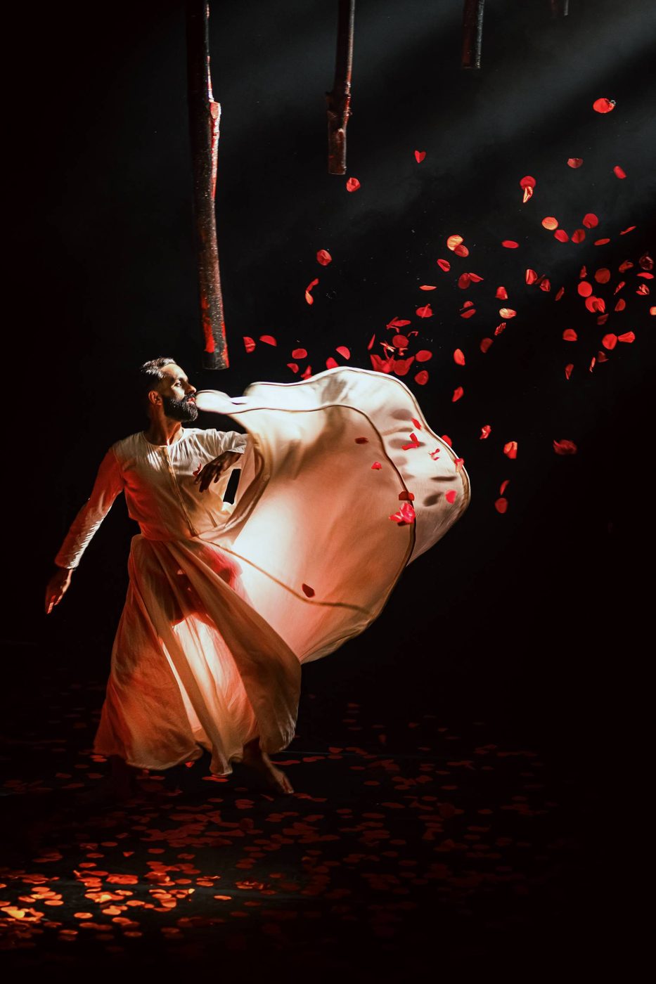 Header image description: A man is wearing a gold floaty outfit and a gold hat. He has red rose petals flying all around him and his arms up as though he is spinning. He looks peaceful.